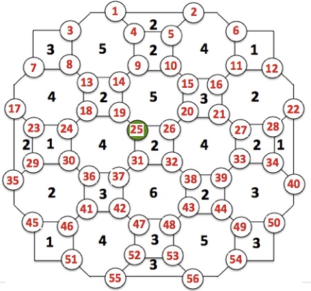 A 29 szobás kastély alaprajzában a szobák közötti átjárókat (azaz az 56 darab ajtót) jelölik a számozott körök. A szobákba írt számok pedig azt jelzik, hogy a szobához tartozó átjárók közül hány van kinyitva.