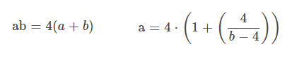 A megoldandó feladat: ab = 4(a+b), amiből könnyen látható, hogy a = 4*(1+(4/(b-4)))
