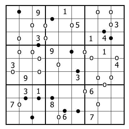 Az ábrában fekete körrel jelöltük az összes olyan vonalat, amely két olyan mezőt választ el egymástól, amelyekben a beírt számok közül az egyik kétszerese a másiknak. A fehér körrel elválasztott mezőkbe kerülő számok különbsége pedig mindig 1.