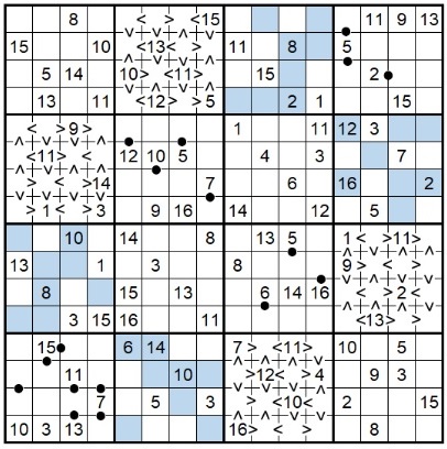 Töltsd ki az ábrát 1-16-ig terjedő számokkal úgy, hogy minden sorban és oszlopban, valamint a vastag vonalakkal határolt területeken belül minden szám egyszer szerepeljen! Az egyes területeken belül 4 különböző típust vegyítettünk: