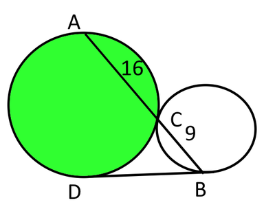 Adott az ábra szerinti két egymást érintő kör, és az érintési ponton átmenő szelő. Ennek a két körben lévő szakasza 9 és 16 egység.